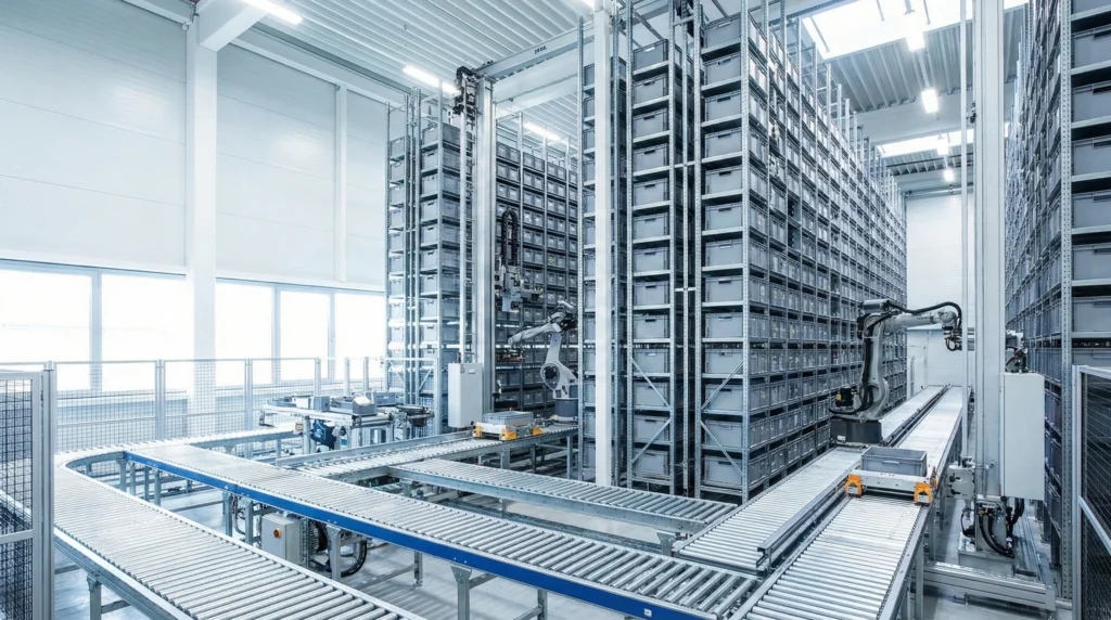 Modern automated storage and retrieval system warehouse with conveyor belts and robotic equipment