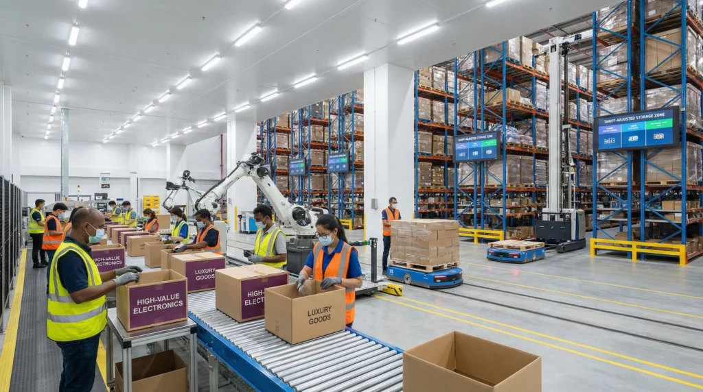 International warehouse workers sort high-value imports, with automation adjusting storage for tariff-impacted goods.